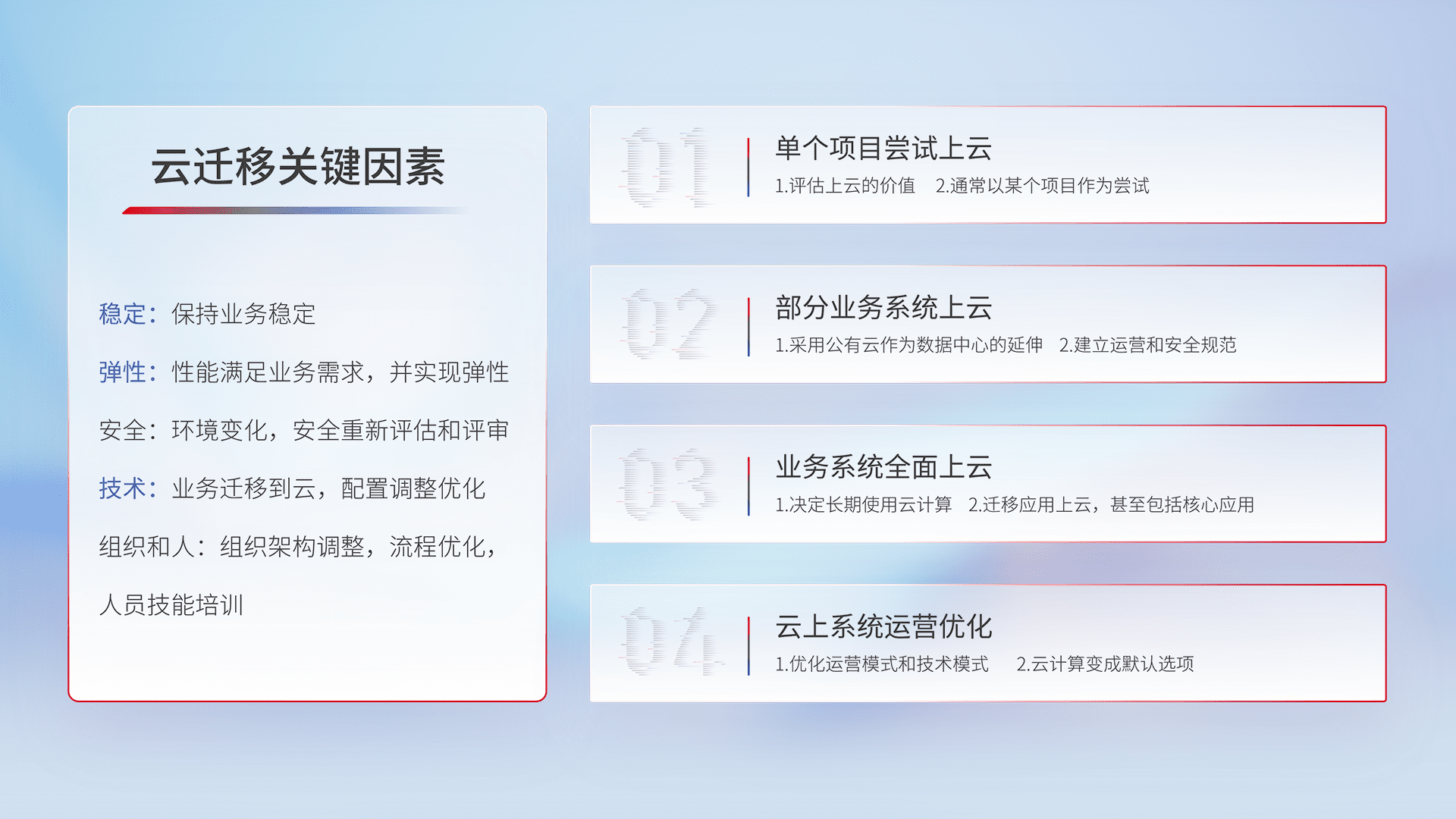 结合实际业务,,,从规划设计、、、、云平台选型、、云原生改造、、、数据迁移、、、、集成交付,,迁移全过程为客户识别最佳上云路径,,做好风险识别管理,,设计网络架构、、、身份权限、、、安全审计合规、、、、操作审计、、日志审计、、监控告警策略、、多站点容灾设计等,,,对云上基础设施进行整体规划,,提升IT治理水平,,,,以满足弹性、、高可用、、、、高性能的需求。。。。