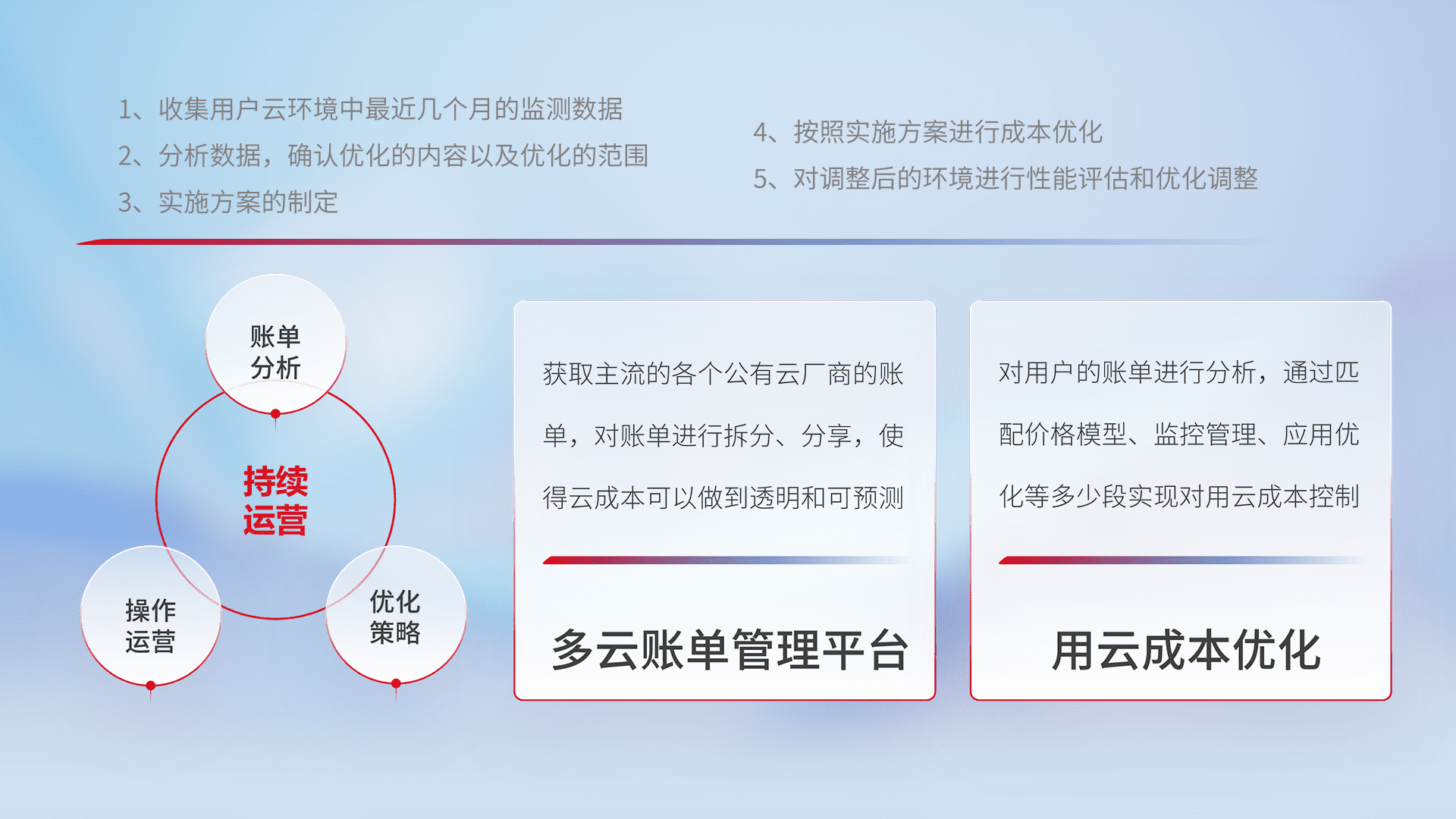 通过多云纳管,,,以统一的资源数据模型把客户的云资源进行抽象和封装,,,进而实现对多云资源的统一操作,,,,保障云资源管理的可靠性、、稳定性与可用性。。。量身定制化运维内容,,,,配置、、、、开发运维、、、、补丁管理、、备份、、、监控、、、、认证和访问管理、、审计和日常巡检等,,,,保障在用云过程中的可靠度,,,稳定度以及高可用率。。。